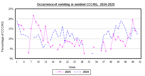 Weekly chart for occurrence of vomiting in sentinel CCC/KG, 2024-2025.  The activity of vomiting in week 50 has decreased.
