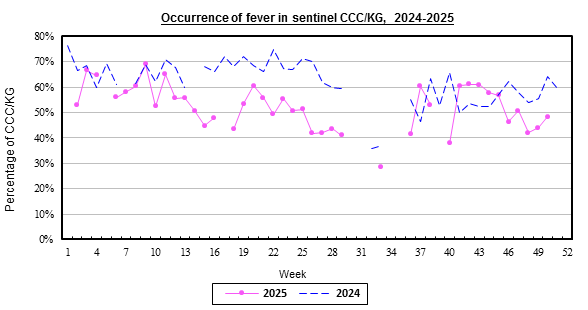 Weekly chart for occurrence of fever in sentinel CCC/KG, 2024-2025.  The activity of fever in week 50 was at baseline level.