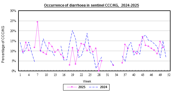 Weekly chart for occurrence of diarrhoea in sentinel CCC/KG, 2024-2025.  The activity of diarrhoea in week 50 was at baseline level.