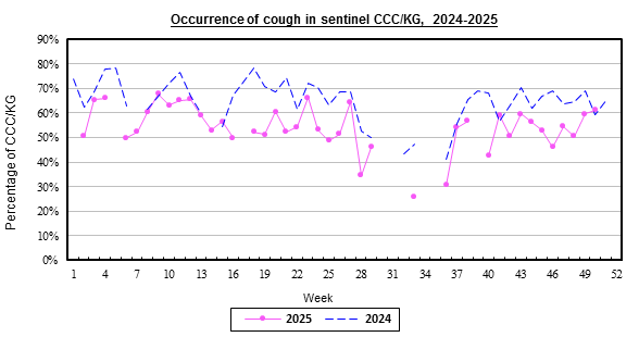 Weekly chart for occurrence of cough in sentinel CCC/KG, 2024-2025.  The activity of cough in week 50 was at baseline level.