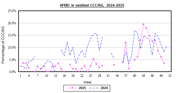 Weekly chart for surveillance of hand, foot and mouth disease in sentinel CCC/KG, 2024-2025.  The activity of hand, foot and mouth disease in week 50 was at baseline level.