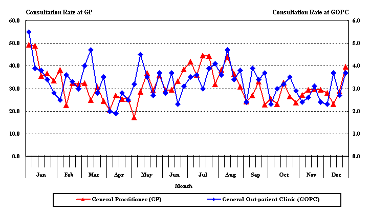 Weekly consultation rates (per 1000 consultations) of acute diarrhoeal diseases in 2010