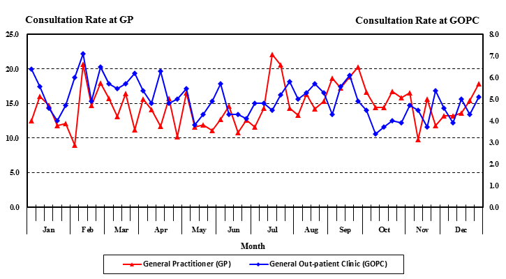 Weekly consultation rates (per 1000 consultations) of acute diarrhoeal diseases in 2016