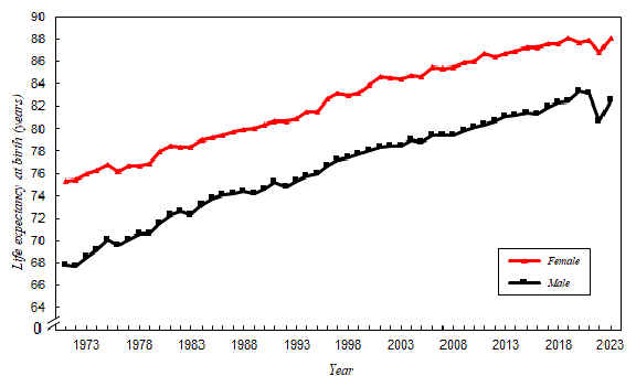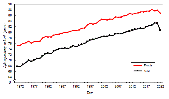 In Hong Kong, the life expectancy at birth increased from 67.8 years for males and 75.3 years for females in 1971 to 82.7 years and 88.2 years respectively in 2024. The life expectancy at birth in 2022 should be interpreted with care as the figures are affected by exceptionally high mortality rates in 2022 during the COVID-19 epidemic. Nevertheless, the life expectancy at birth of both males and females at birth rebounded in 2023. The life expectancy at birth of Hong Kong in 2024 was among the highest in the world.