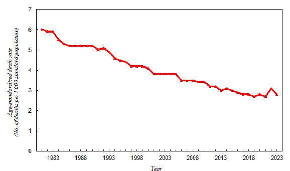 In Hong Kong, the age-standardised death rate* decreased from 6.0 per 1 000 standard population in 1981 to 2.5 in 2024.![]() Notes: The figures are based on deaths registered under the Births and Deaths Registration Ordinance (Cap. 174, Laws of Hong Kong) during the specified period. * Based on the world standard population specified in GPE Discussion Paper Series: No.31, EIP/GPE/EBD, World Health Organization, 2001. |