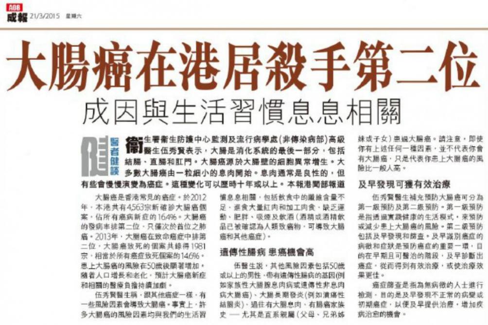 报章专题:「大肠癌在港居杀手第二位 成因与生活习惯息息相关」