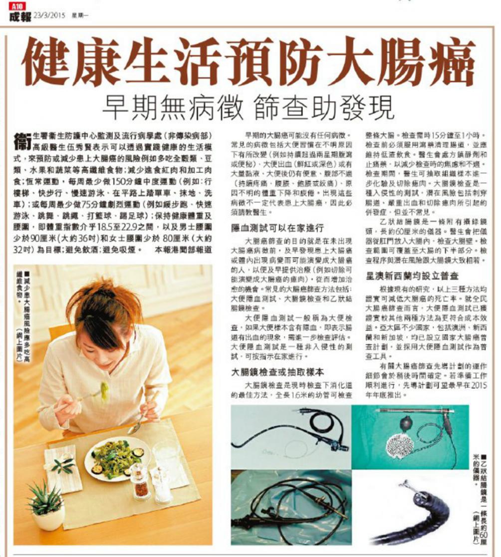 文章转自《成报》2015年3月21日的报道,内容有关大肠癌的资讯。请