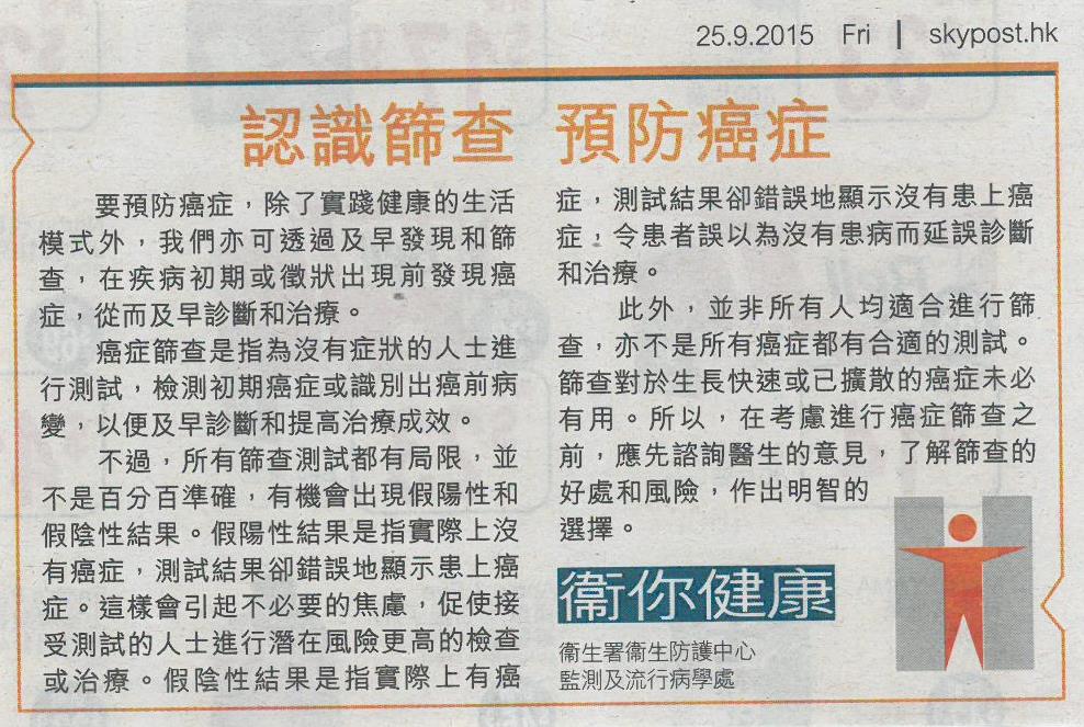文章转自《晴报》2015年9月25日的报道,介绍有关癌症筛查的资讯。请