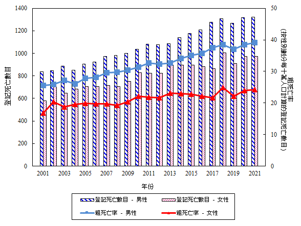 二 零 零 一 年 至 二 零 二 三 年 按 性 别 划 分 大 肠 癌 的 登 记 死 亡 数 目 和 粗 死 亡 率 (检视)