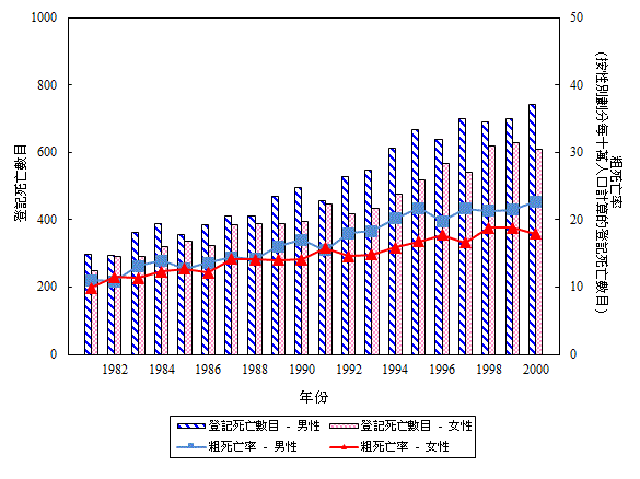 一 九 八 一 年 至 二 零 零 零 年 按 性 别 划 分 大 肠 癌 的 登 记 死 亡 数 目 和 粗 死 亡 率 (检视)
