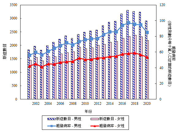 二 零 零 一 年 至 二 零 二 二 年 按 性 别 划 分 大 肠 癌 的 新 症 数 目 和 粗 发 病 率 (检视)
