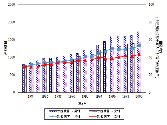 一 九 八 三 年 至 二 零 零 零 年 按 性 别 划 分 大 肠 癌 的 新 症 数 目 和 粗 发 病 率 (检视)