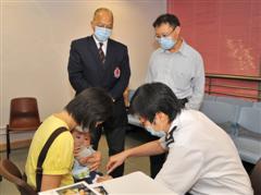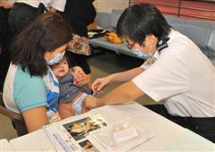 在医生和护士的指导下,约一百八十名医疗辅助队成员由今日(九月六日)起于指定星期日在卫生署二十九间母婴健康院为二零零七年九月一日至二零零九年六月三十日出生的儿童提供免费肺炎球菌结合疫苗补种服务。 医疗辅助队成员在今年初接受密集的训练课程和在母婴健康院进行临牀实 图(一)示卫生署卫生防护中心总监曾浩辉医生(右)与医疗辅助队总参事陈耀荣博士于西湾河母婴健康院巡视儿童接种肺炎球菌结合疫苗。 图(二)示儿童在西湾河母婴健康院接种肺炎球菌结合疫苗。 2009年9月6日(星期日)