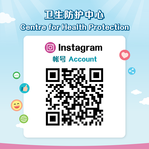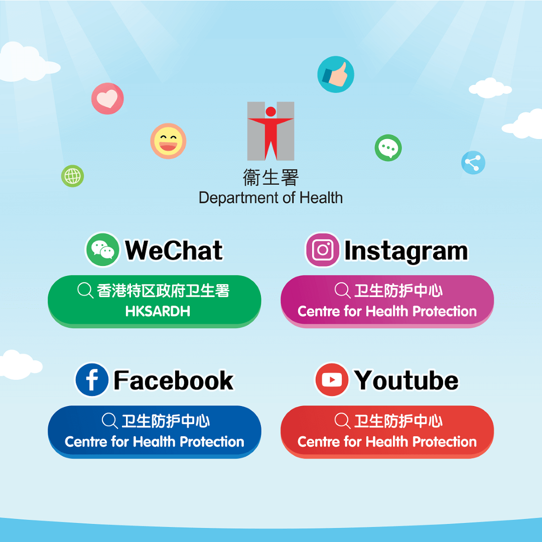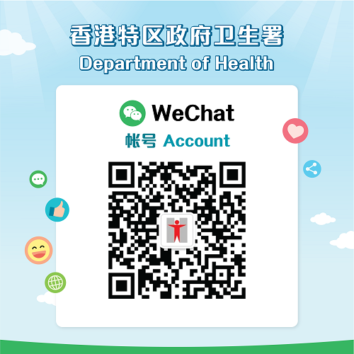 卫生署已开设YouTube官方频道、Facebook官方专页、Instagram官方账户及微信官方账号。公众可于微信平台搜寻「香港特区政府卫生署」或扫描二维码(见下方),欢迎浏览、关注及分享该账号的信息。