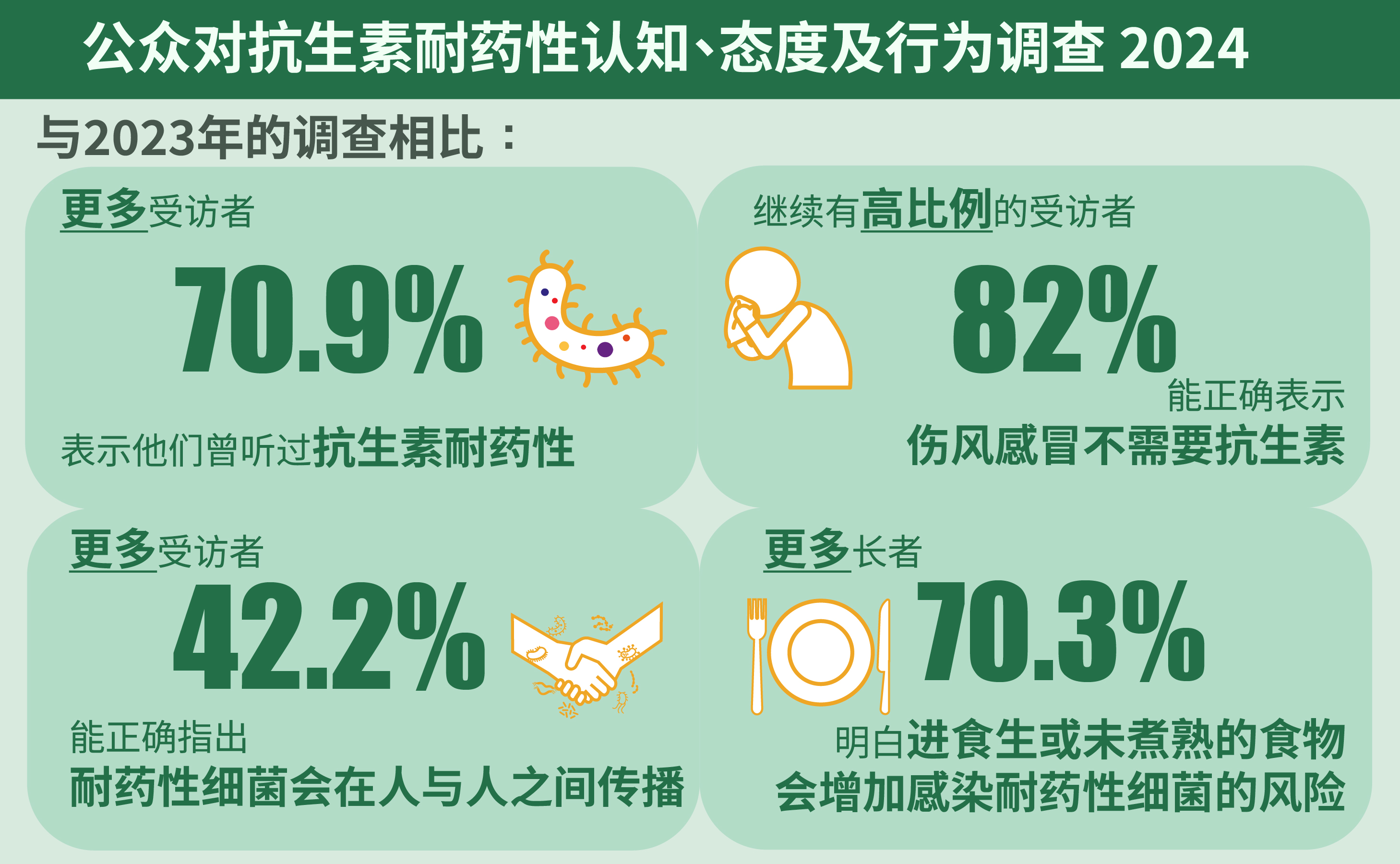 卫生署利用2023年调查的结果制定2024年世界抗菌药物耐药性宣传周的主要资讯和宣传策略。2024年调查结果显示,上次调查发现的主要差距有所改善。这凸显了制定和实施有针对性的、基于证据的健康促进计划对于提高公众对抗菌素耐药性的认识和行动是有效的。本次调查显示,需要进一步提高公众的食物安全知识和实践,以降低由食物感染耐药性细菌的风险。
