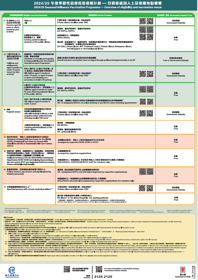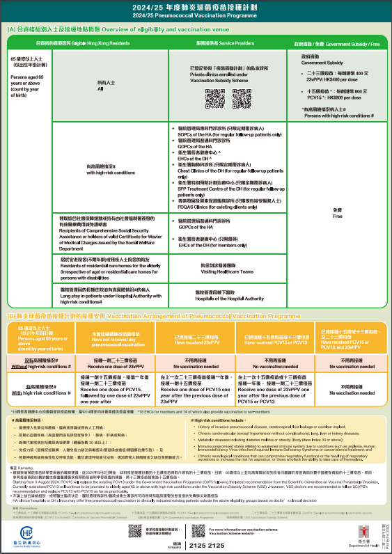 政府會安排各個組別的合資格人士接種季節性流感疫苗,而長者接種肺炎球菌疫苗會於全年繼續進行,詳情請參閱以下海報: