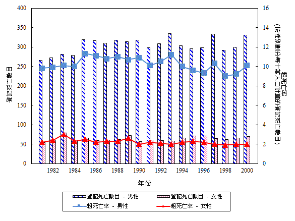 一 九 八 一 年 至 二 零 零 零 年 按 性 別 劃 分 食 道 癌 的 登 記 死 亡 數 目 和 粗 死 亡 率 (檢視)