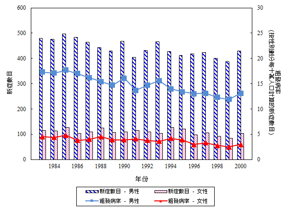 一 九 八 三 年 至 二 零 零 零 年 按 性 別 劃 分 食 道 癌 的 新 症 數 目 和 粗 發 病 率 (檢視)