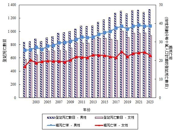二 零 零 一 年 至 二 零 二 三 年 按 性 別 劃 分 大 腸 癌 的 登 記 死 亡 數 目 和 粗 死 亡 率 (檢視)
