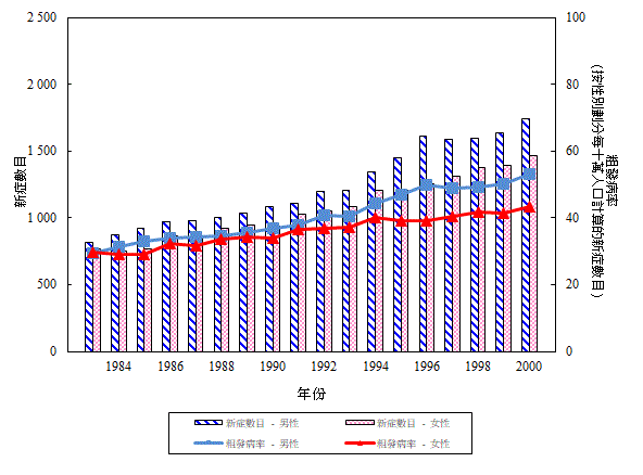 一 九 八 三 年 至 二 零 零 零 年 按 性 別 劃 分 大 腸 癌 的 新 症 數 目 和 粗 發 病 率 (檢視)