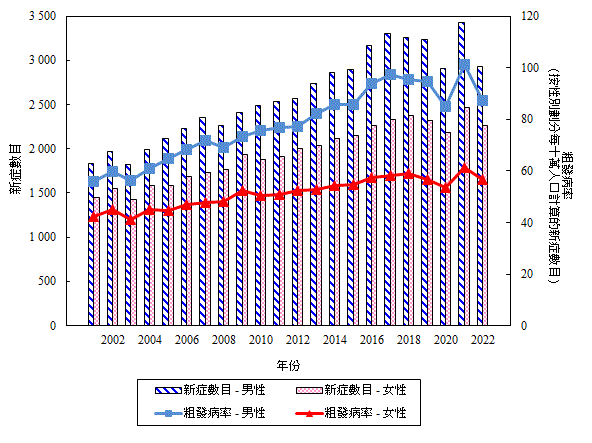 二 零 零 一 年 至 二 零 二 二 年 按 性 別 劃 分 大 腸 癌 的 新 症 數 目 和 粗 發 病 率 (檢視)