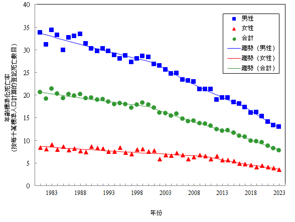 男 女 合 計 、 男 性 及 女 性 的 肝 癌 年 齡 標 準 化 死 亡 率 在 過 去 43 年 和 過 去 10 年 均 呈 下 降 趨 勢 ( 一 九 八 一 年 至 二 零 二 三 年 的 平 均 每 年 百 分 比 變 化 (AAPC) # : 分 別 為 -2.3% 、 -2.3% 及 -2.0% ; 二 零 一 四 年 至 二 零 二 三 年 的 AAPC : 分 別 為 -4.5% 、 -4.2% 及 -4.3% ) 。