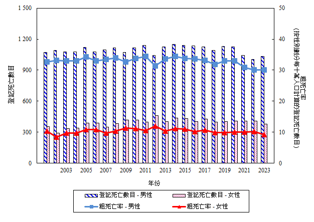 | 由 二 零 零 一 年 起 , 疾 病 及 死 因 分 類 乃 根 據《疾 病 和 有 關 健 康 問 題 的 國 際 統 計 分 類》(ICD) 第 十 次 修 訂 本 。 二 零 零 一 年 及 以 後 的 數 字 未 必 可 與 以 往 年 份 根 據 ICD 第 九 次 修 訂 本 所 編 製 的 數 字 互 相 比 較 。 | ||