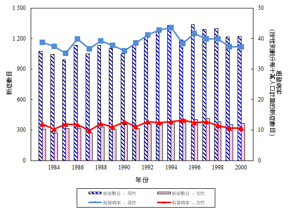 一 九 八 三 年 至 二 零 零 零 年 按 性 別 劃 分 肝 癌 的 新 症 數 目 和 粗 發 病 率 (檢視)
