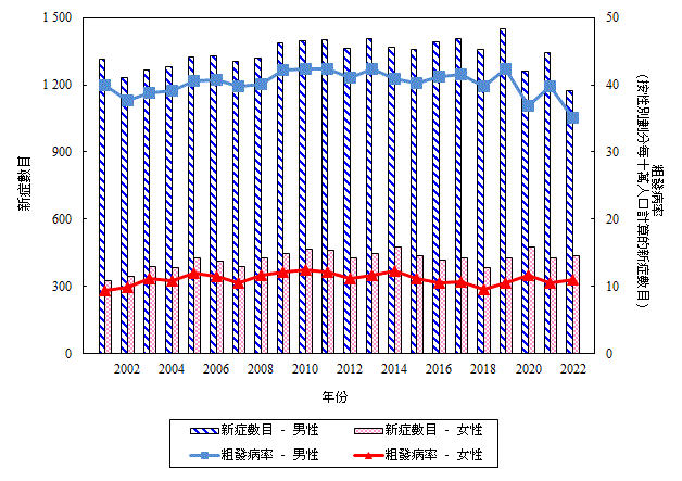 二 零 零 一 年 至 二 零 二 二 年 按 性 別 劃 分 肝 癌 的 新 症 數 目 和 粗 發 病 率 (檢視)