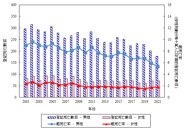 | 由 二 零 零 一 年 起 , 疾 病 及 死 因 分 類 乃 根 據《疾 病 和 有 關 健 康 問 題 的 國 際 統 計 分 類》(ICD) 第 十 次 修 訂 本 。 二 零 零 一 年 及 以 後 的 數 字 未 必 可 與 以 往 年 份 根 據 ICD 第 九 次 修 訂 本 所 編 製 的 數 字 互 相 比 較 。 | ||