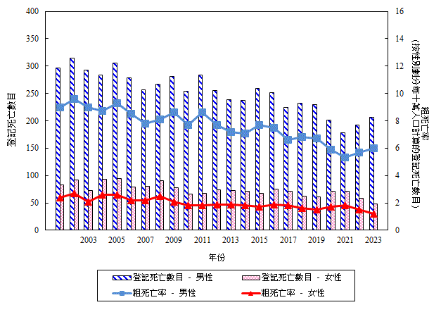 二 零 零 一 年 至 二 零 二 三 年 按 性 別 劃 分 鼻 咽 癌 的 登 記 死 亡 數 目 和 粗 死 亡 率 (檢視)