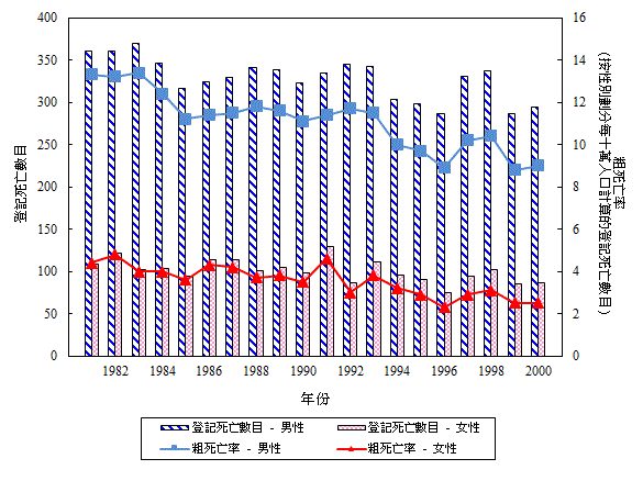 一 九 八 一 年 至 二 零 零 零 年 按 性 別 劃 分 鼻 咽 癌 的 登 記 死 亡 數 目 和 粗 死 亡 率 (檢視)