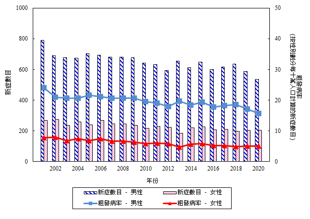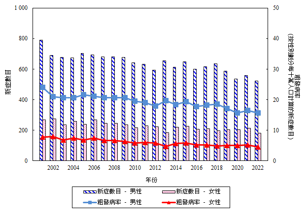 二 零 零 一 年 至 二 零 二 二 年 按 性 別 劃 分 鼻 咽 癌 的 新 症 數 目 和 粗 發 病 率 (檢視)