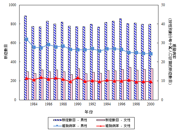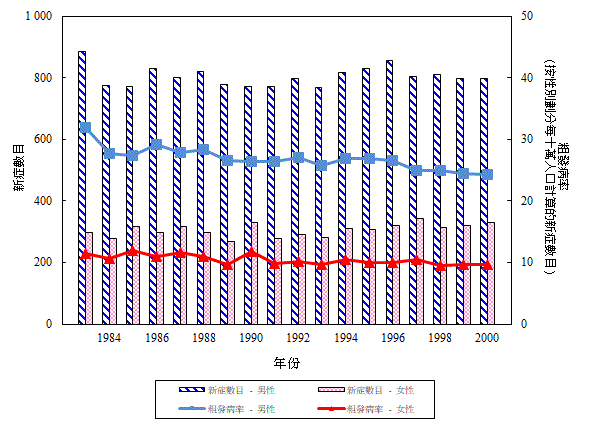 一 九 八 三 年 至 二 零 零 零 年 按 性 別 劃 分 鼻 咽 癌 的 新 症 數 目 和 粗 發 病 率 (檢視)