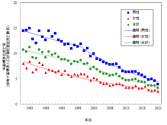 男 女 合 計 、 男 性 及 女 性 的 胃 癌 年 齡 標 準 化 死 亡 率 在 過 去 43 年 和 過 去 10 年 均 呈 下 降 趨 勢 ( 一 九 八 一 年 至 二 零 二 三 年 的 平 均 每 年 百 分 比 變 化 (AAPC) # : 分 別 為 -2.6% 、 -2.8% 及 -2.6% ; 二 零 一 四 年 至 二 零 二 三 年 的 AAPC : 分 別 為 -3.5% 、 -3.8% 及 -2.6% ) 。