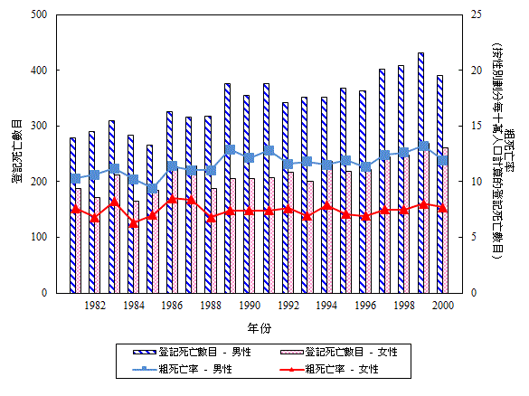 一 九 八 一 年 至 二 零 零 零 年 按 性 別 劃 分 胃 癌 的 登 記 死 亡 數 目 和 粗 死 亡 率 (檢視)