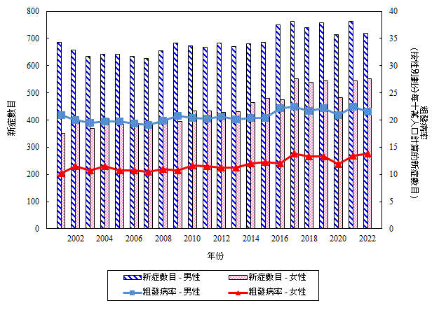 二 零 零 一 年 至 二 零 二 二 年 按 性 別 劃 分 胃 癌 的 新 症 數 目 和 粗 發 病 率 (檢視)