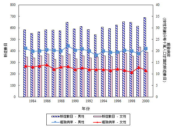 一 九 八 三 年 至 二 零 零 零 年 按 性 別 劃 分 胃 癌 的 新 症 數 目 和 粗 發 病 率 (檢視)