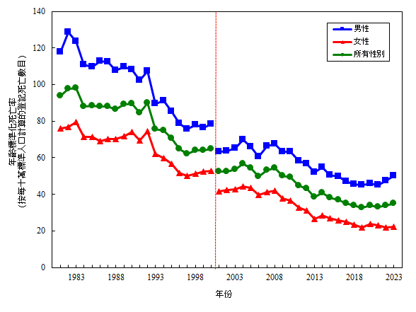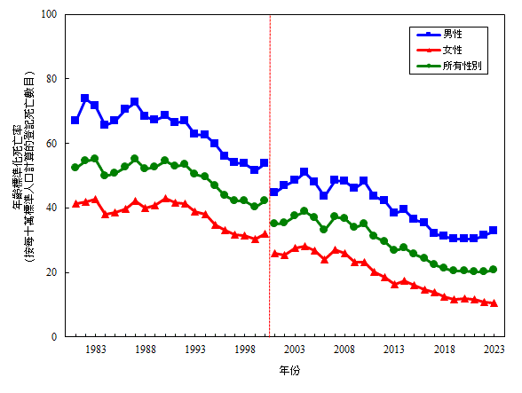 一 九 八 一 年 至 二 零 二 三 年 按 性 別 劃 分 冠 心 病 的 年 齡 標 準 化 死 亡 率