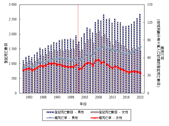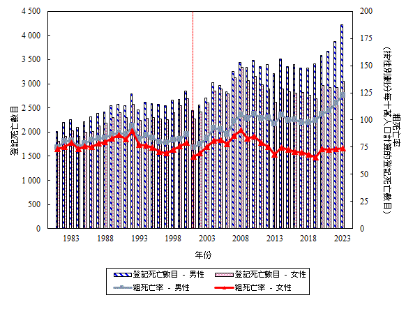 一 九 八 一 年 至 二 零 二 三 年 按 性 別 劃 分 冠 心 病 的 登 記 死 亡 數 目 和 粗 死 亡 率 (檢視)