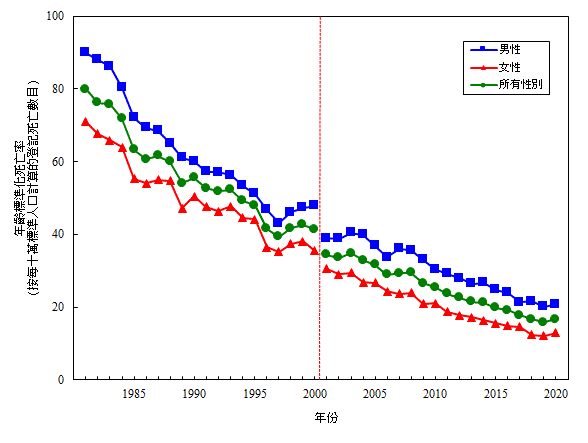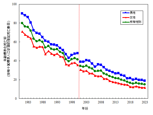 一 九 八 一 年 至 二 零 二 三 年 按 性 別 劃 分 的 腦 血 管 病 的 年 齡 標 準 化 死 亡 率