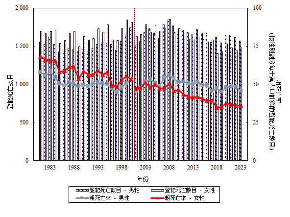 一 九 八 一 年 至 二 零 二 三 年 按 性 別 劃 分 腦 血 管 病 的 登 記 死 亡 數 目 和 粗 死 亡 率 (檢視)