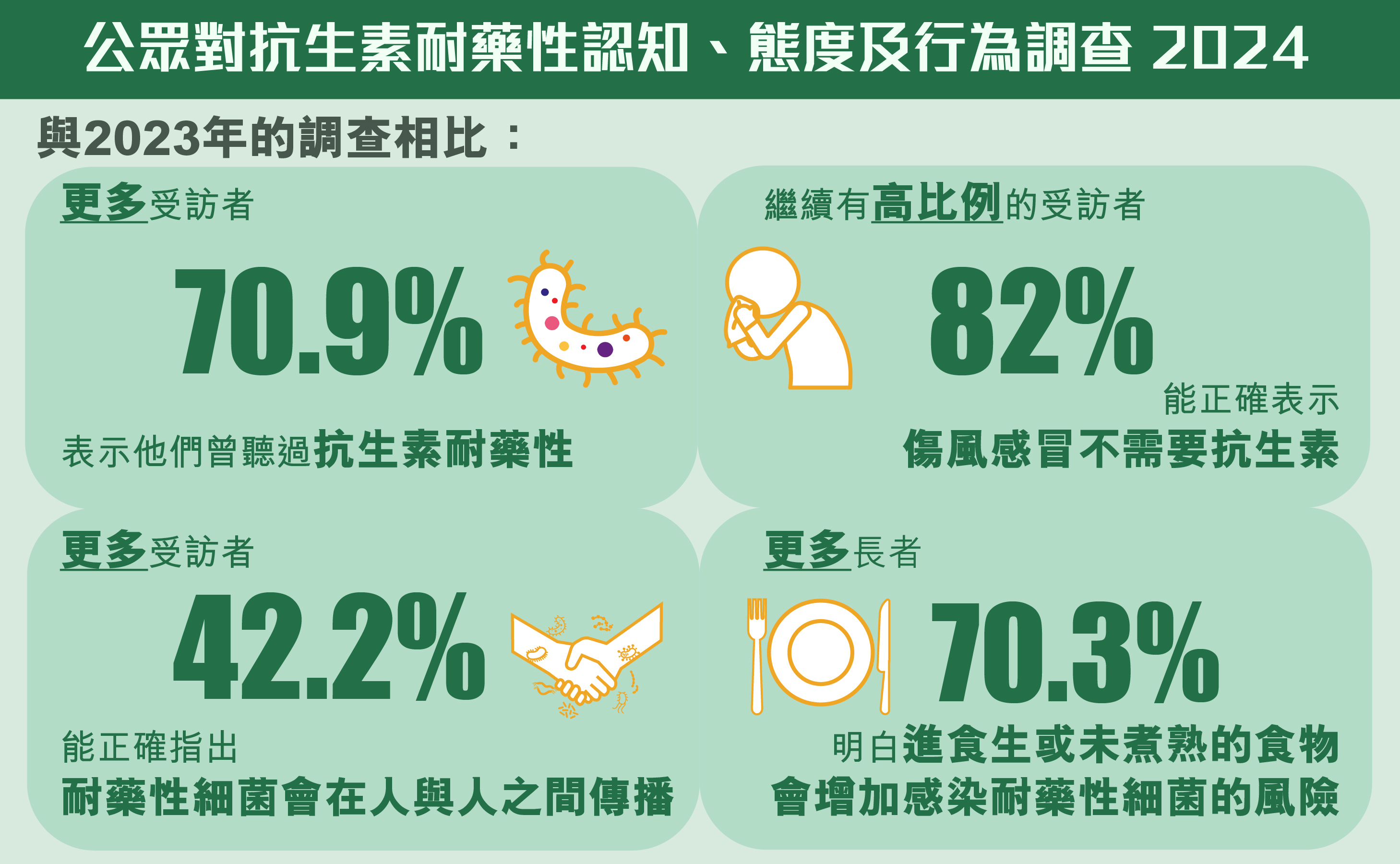衞生署利用2023年調查的結果制定2024年世界抗菌藥物耐藥性宣傳週的主要資訊和宣傳策略。2024年調查結果顯示,上次調查發現的主要差距有所改善。這凸顯了製定和實施有針對性的、基於證據的健康促進計劃對於提高公眾對抗菌素耐藥性的認識和行動是有效的。本次調查顯示,需要進一步提高公眾的食物安全知識和實踐,以降低由食物感染耐藥性細菌的風險。