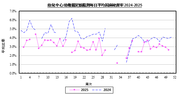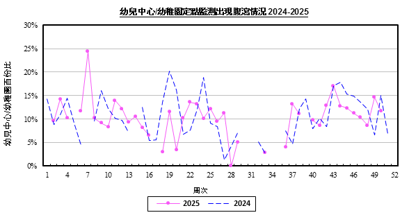 此簡報由衞生防護中心按「幼兒中心/幼稚園傳染病定點監測計劃」每星期所得的資料編製,目的是讓公眾了解有關資料所總結出來的社區傳染病情況。本簡報中的資料數據僅供參考,並不代表任何個別定點幼兒中心/幼稚園或地區的情況。