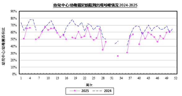 | 出現咳嗽的幼兒中心/幼稚園百分比 | 61.18 | 59.76 | 50.62 | 54.55 |