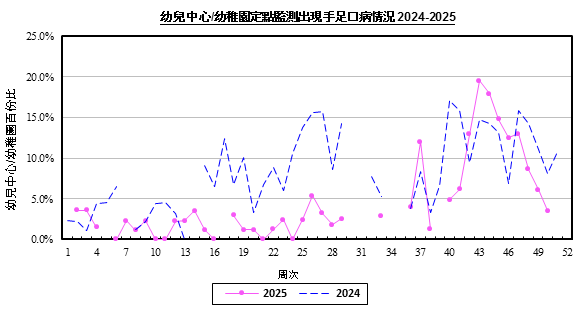 | 出現手足口病的幼兒中心/幼稚園百分比 | 3.53 | 6.10 | 8.64 | 12.99 |
