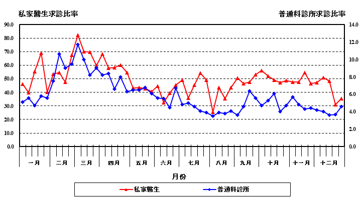 此圖顯示在二零一六年,普通科診所的流行性感冒病類求診率每一千個診症為3.5至11.7,而私家醫生的流行性感冒病類求診率為25.6至82.3。