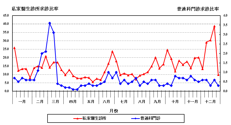 此圖顯示私家醫生診所的最新流行性感冒病類求診率有所下降。